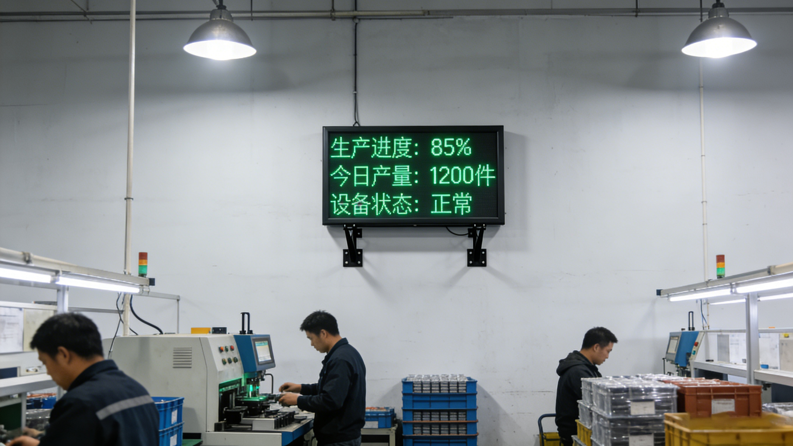 适配中小型生产车间、产线工位旁、车间过道等空间有限的场景,尤其适合单一工位、小型产线的近距离查看需求。采用LED单色显示(常用红色、绿色),显示清晰、字体醒目且不刺眼,完美适配车间内部光线环境。定制亮点突出“小巧适配、便捷实用”,整体体积设计紧凑,采用壁挂式安装方式,无需占用地面空间,可根据工位布局灵活选择安装位置(如产线旁墙面、工位上方墙面),不影响一线操作工作业动线。显示内容可根据工位核心需求精简定制,重点聚焦单一产线的产量、生产节拍、设备运行状态(如运行/停机)、当日完成率等核心数据,不添加冗余信息,确保一线操作工快速抓取关键内容。同时定制手动操作功能,支持人工切换班次、产量清零、计数统计,操作按钮设计简洁,无需专业培训,一线员工可快速上手;边框采用简约窄边设计,防尘易清洁,可有效抵御车间粉尘侵蚀,适配中小型车间的复杂环境,使用寿命长,性价比突出。