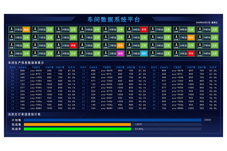 可全程监控当前(从总装→测试→油漆→包装等)现场所有工序的计划工作量和实际工作量的完成情况。并在现场大屏幕看板上显示出来,即时对比工作进度,在出现问题时即时通知相关负责人员,并形成历史实际工作量和历史计划工作量的曲线对比记录图表。
