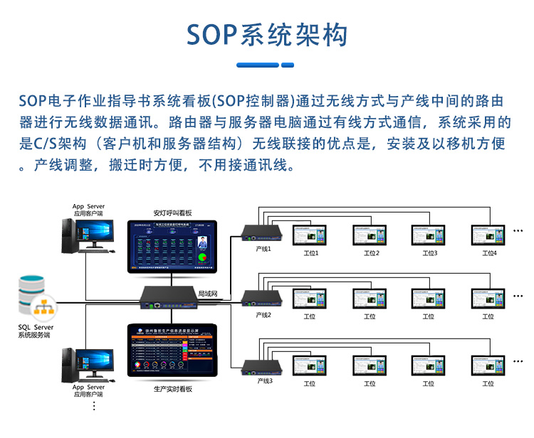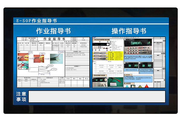 E-SOP:是非常重要的指导生产的工艺文件,怎样让员工使用方便、快捷、经济,怎样让整个SOP发放回收流程简化是重要的课题。一直以来,SOP的使用都是采用打印的纸悬挂在作业员正前方,这种方式看似成本低,实则成本相当高。所以现在欧美日资都外企,都已经不再采用以纸为媒介的悬挂方式,而是采用显示器、网络等高科技方式。此E-SOP项目的开发,不仅能够让每个工位实时掌握生产的工艺信息,而且能够将自己的工作状态及异常原因实时反馈给后台,方便管理者进行查询、了解。