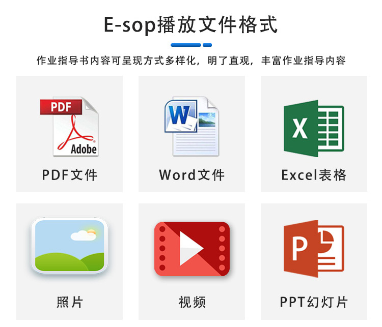 E-SOP电子作业指导书系统也彰显了一个公司的整理管理能力和生产实力,也表现出更加规范和科学的管理办法。E-SOP电子作业指导书也可全面的融合生产管理看板系统、MES系统、工厂无线安灯呼叫系统全面融合,苏州永升源智能科技有限公司具备一站式的配套方案解决能力,从硬件到软件均实现自主研发和设计。