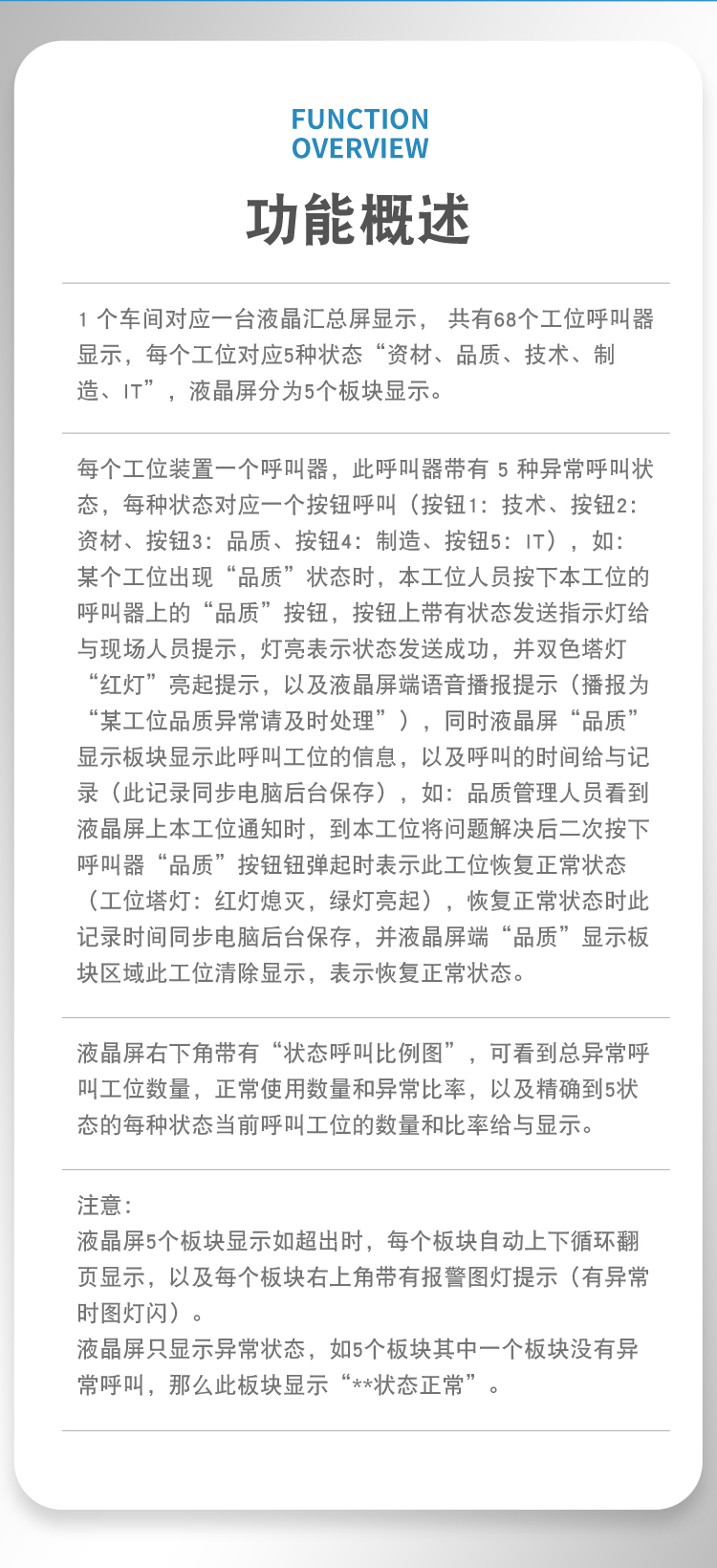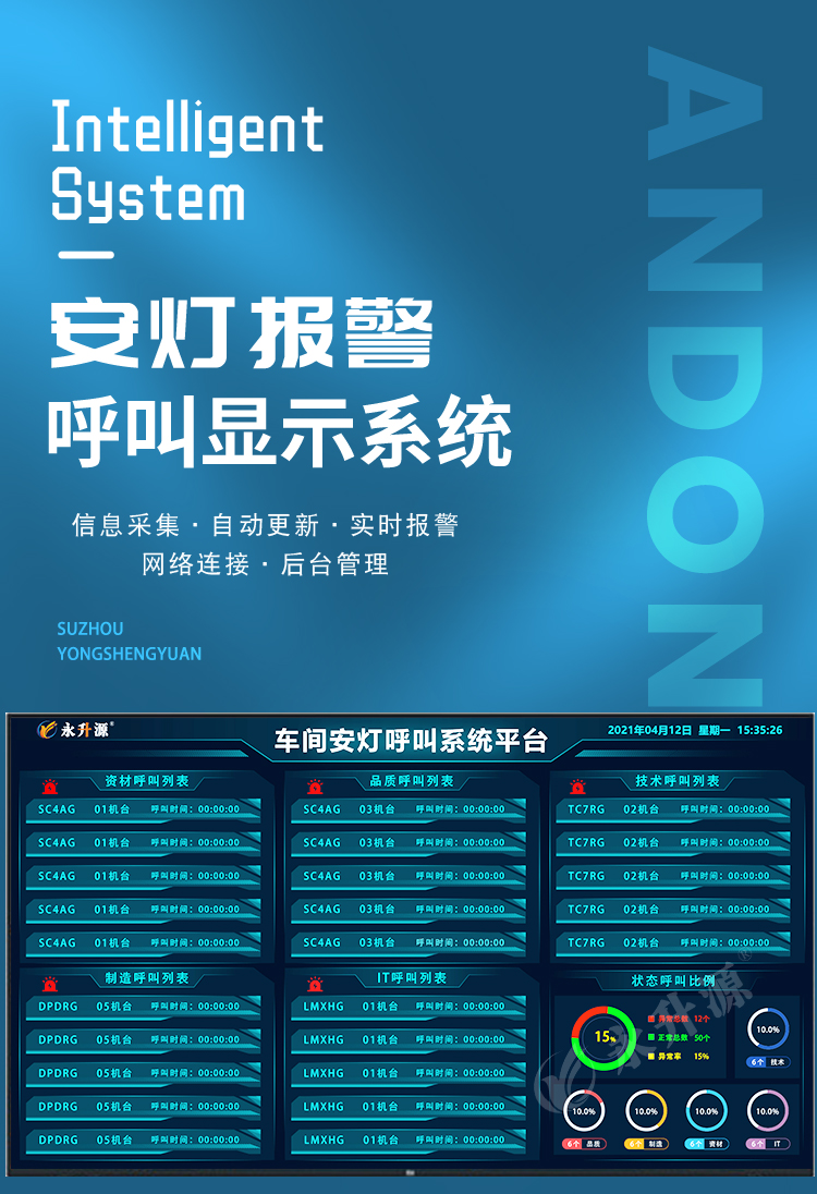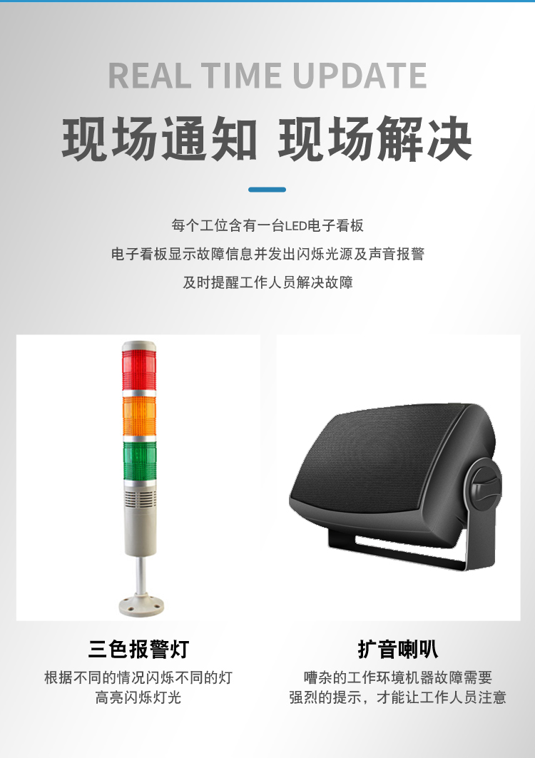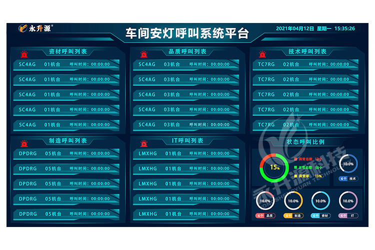 工厂质量安灯呼叫系统能够收集生产线上有关设备、生产以及管理的多方面信息。在对这些信息进行处理后,工厂质量安灯呼叫系统控制分布在整个车间的指示灯和声音报警系统,每个工位都有控制开关,当出现问题时,可及时反映到主机,通知其它部门解决,并可由计算机记录、分析问题频率。可以应用于生产工艺流程的所有相关者,包括:生产岗位人员、生产组长、生产主管、质量工程师、质量主管、制造工程师、物料管理员、采购主管、设备维护工程师、设备主管、生产厂长等。