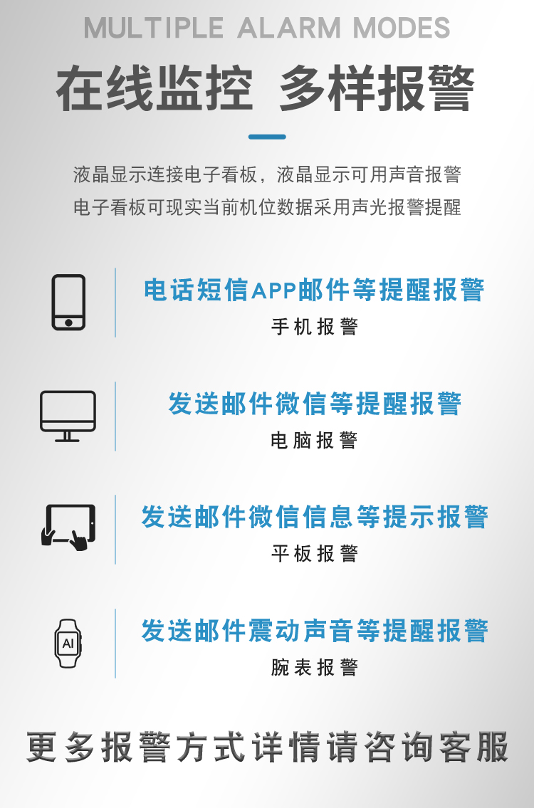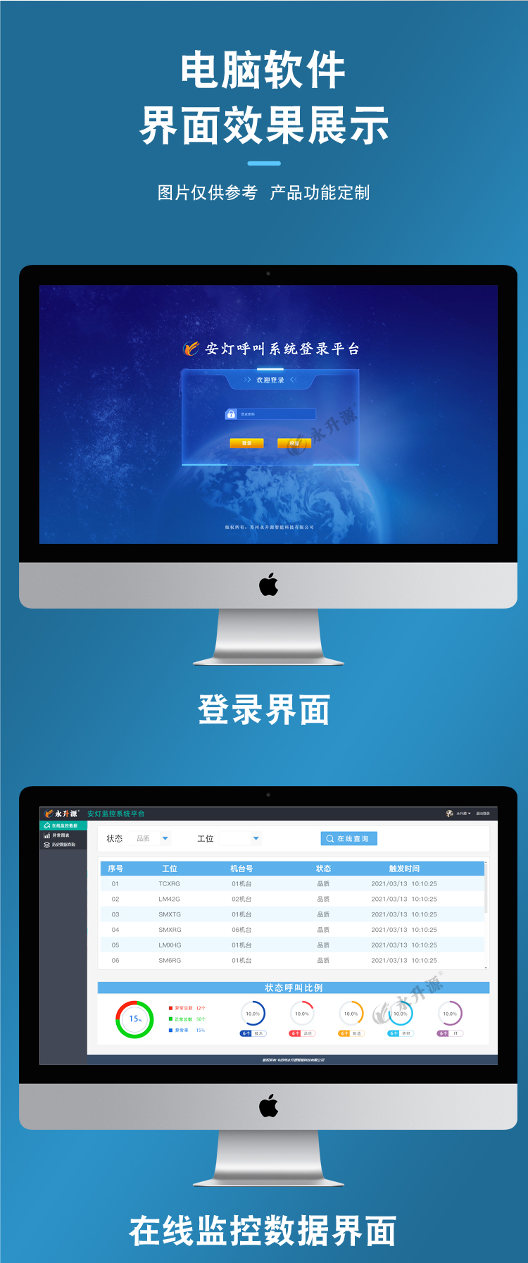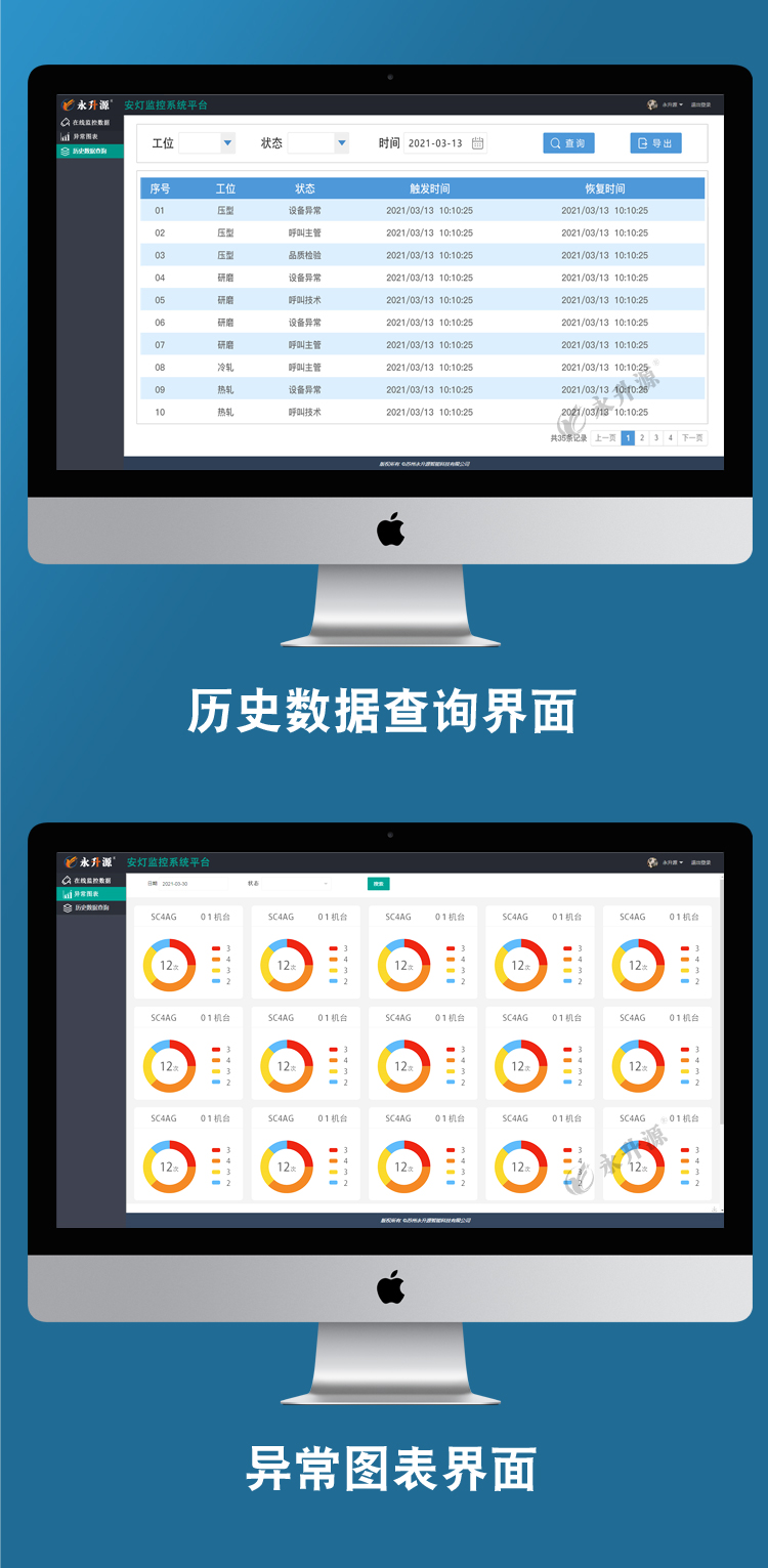 工厂质量安灯呼叫系统以实时监控生产过程中各工位的生产工作状态为目的。实现制造业在生产过程中出现的各类问题时,能及时发出工位告警,并通知告警相关负责人,时间处理告警工位的问题。同时实时记录个站点的告警状态,告警时间,处理时间。用于协同各部门及时处理告警,降低停机时间,提高设备开机率,提高生产效率。生产管理及其技术人员可通过手机或者办公室电脑随时查看生产线运行状况,从而实现远程移动办公。
