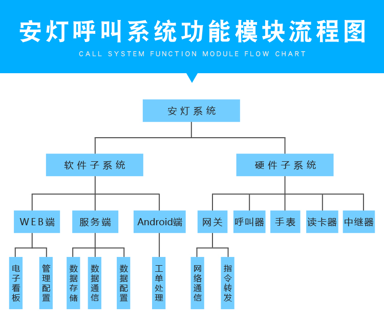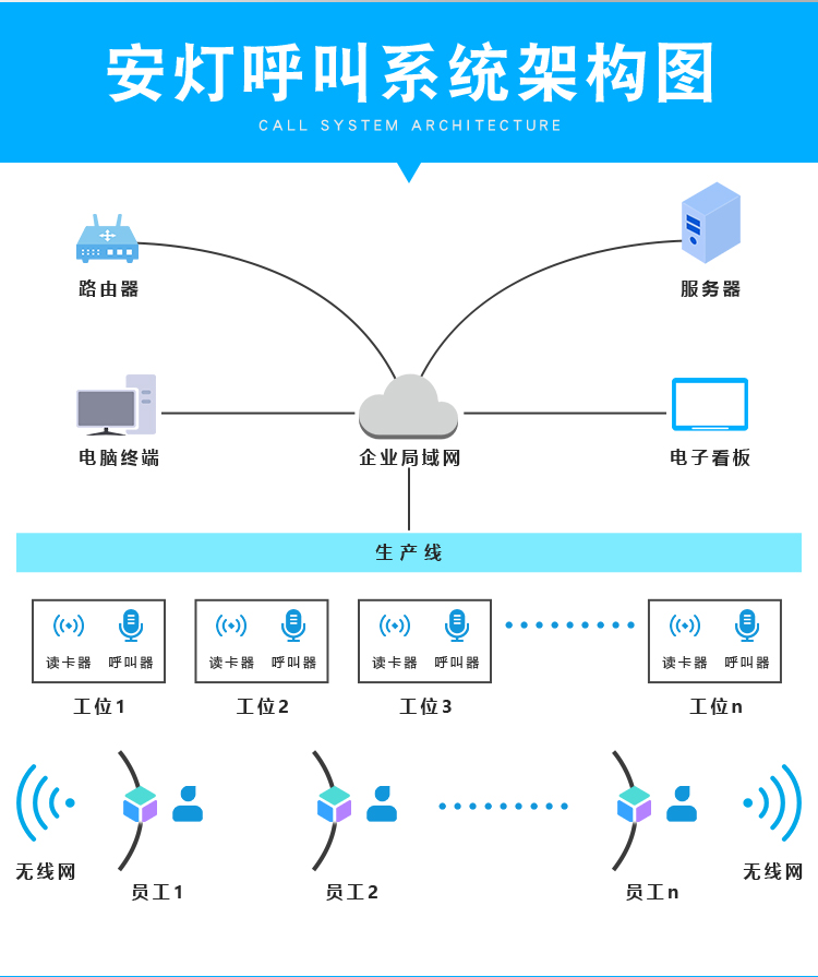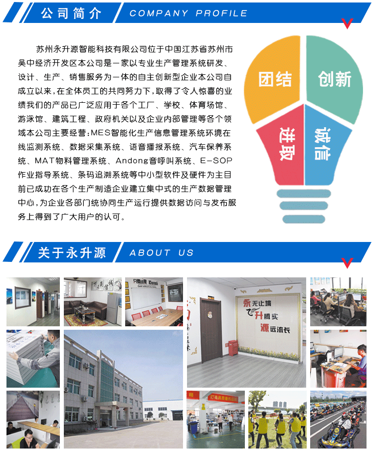 并实时监控事件过程、事件的发起时间,事件的响应时间,以及事件处理时间,一定时间规则内未响应或未处理结束,自动逐级汇报主管。同时对事件的处理做知识日志文档,包括事件的原因、事件的对策等。工厂质量安灯呼叫系统基于无线FSK调频430Mhz或230Mhz(公用免费频段)双向数字传送技术、双向验证以及PC Base技术采集控制模式,实现架构简单、灵活布置、维护简单、可操作性、可扩展性。系统采用无线双向验证方式,保证数据通讯的正确及可视,可靠性同有线数传。工厂质量安灯呼叫系统作为生产全过程组织的一个辅助工具,能实现快速的信息传递、申请呼叫、实时显示、统计分析、报表生成等,就工序作业、设备状态、质量问题、供应物料情况等过程进行实时的信息传递和管理,对生产全过程构成支撑。