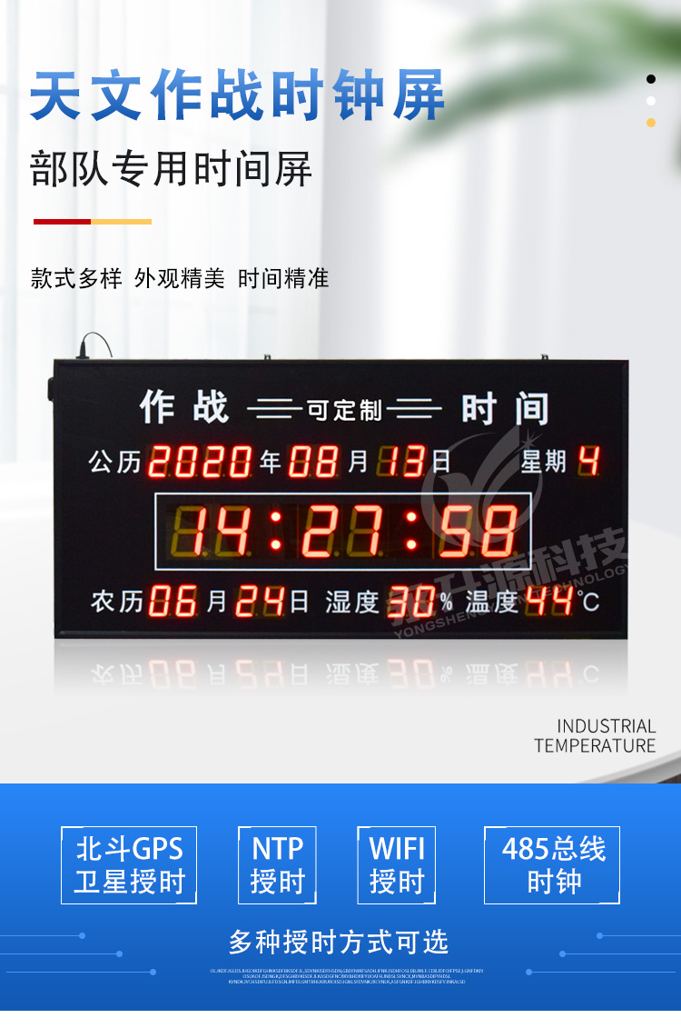 时间是军队作战、演习等等相关军事活动的基准,因此对于天文作战时间电子钟的要求也是非常重视的、其产品的效率性,准确性有更高的要求。因为很多的军事信息时需要保密的,部队原本也是-个严肃的地方,所以对一些东西的要求也是很高的。天文作战时间电子钟中的天文时间其实也就是我们的实际的准确的北京时间,但是作战时间就不同他可以就是单纯的北京时间,也可以是我们自己设定的时间,根据不做演习需要来编辑的时间,这个方面我们做到时间的统一性,也可以达到保密的效果